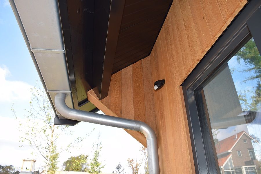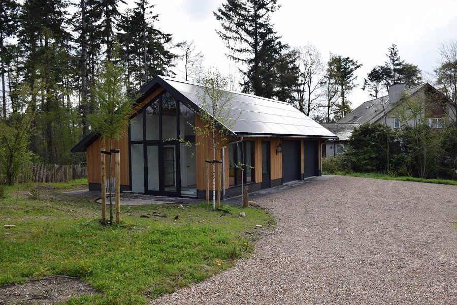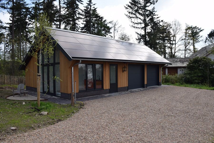Een prachtig tuinverblijf met garage. Door de combinatie van de natuurlijke houtkleur met de bosrijke omgeving, springt dit bijgebouw eruit als een prachtig natuurlijk gebouw. Door het dak te voorzien van zonnepanelen, is het tegelijk ook een duurzaam gebouw!