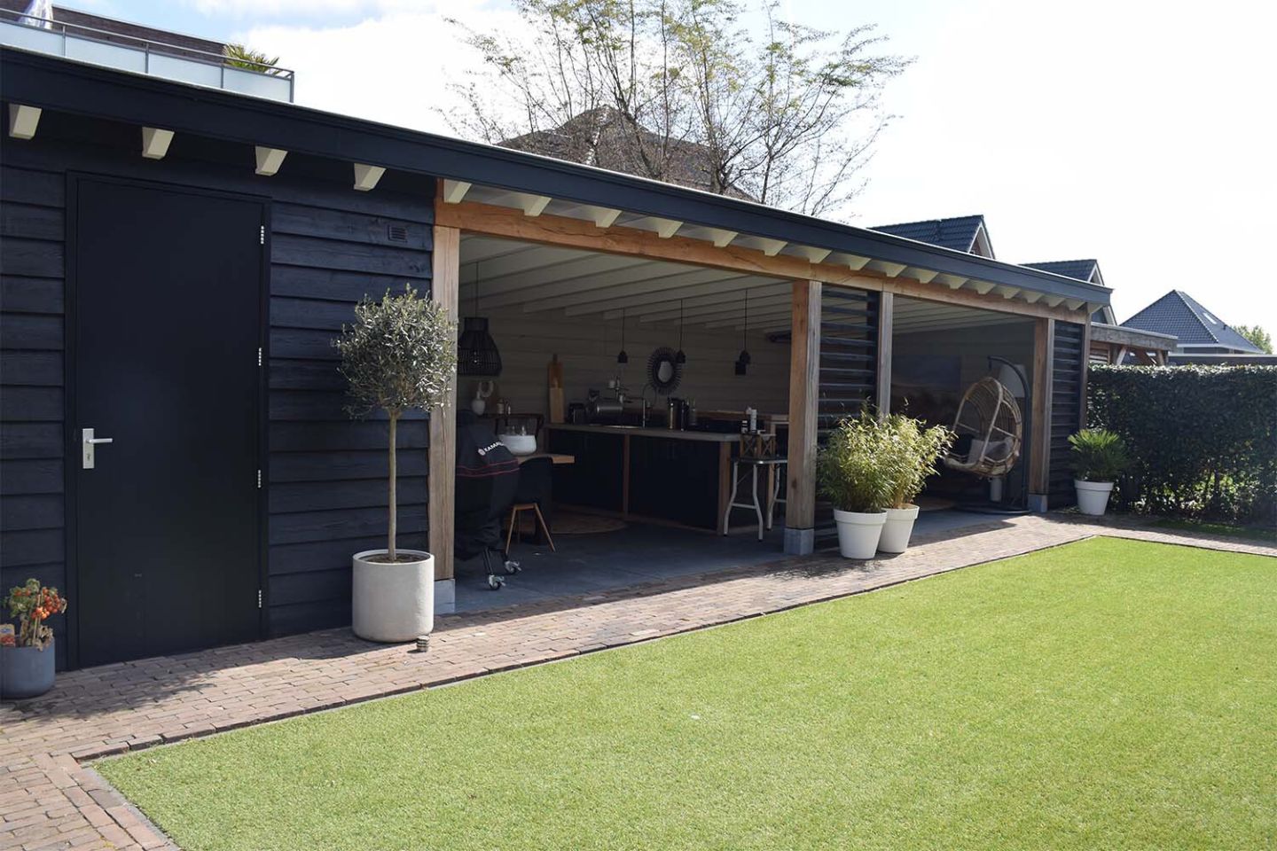 De veranda in combinatie met een schuur, is een prachtige meerwaarde van uw tuin. In de veranda is een zitgedeelte gemaakt, maar van dezelfde materialen ook een bar gecreëerd! Zodat u 's avonds kan genieten van uw wijntje op de bank, maar eventueel ook aan de bar kan zitten. Hierdoor biedt deze veranda allerlei mogelijkheden!