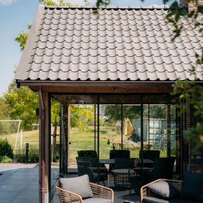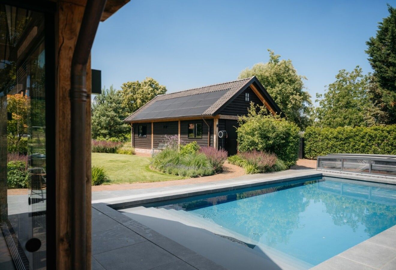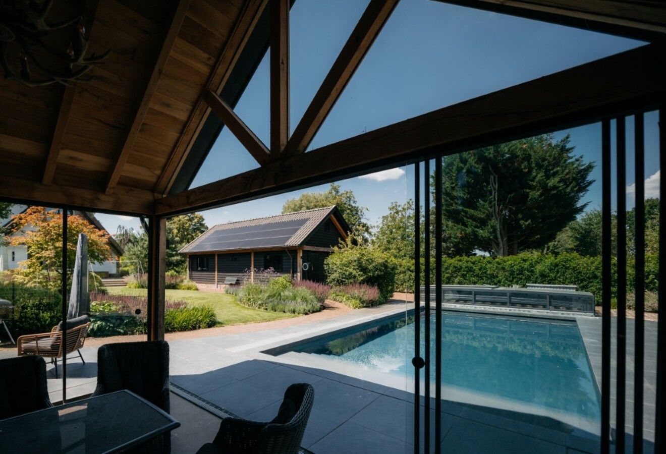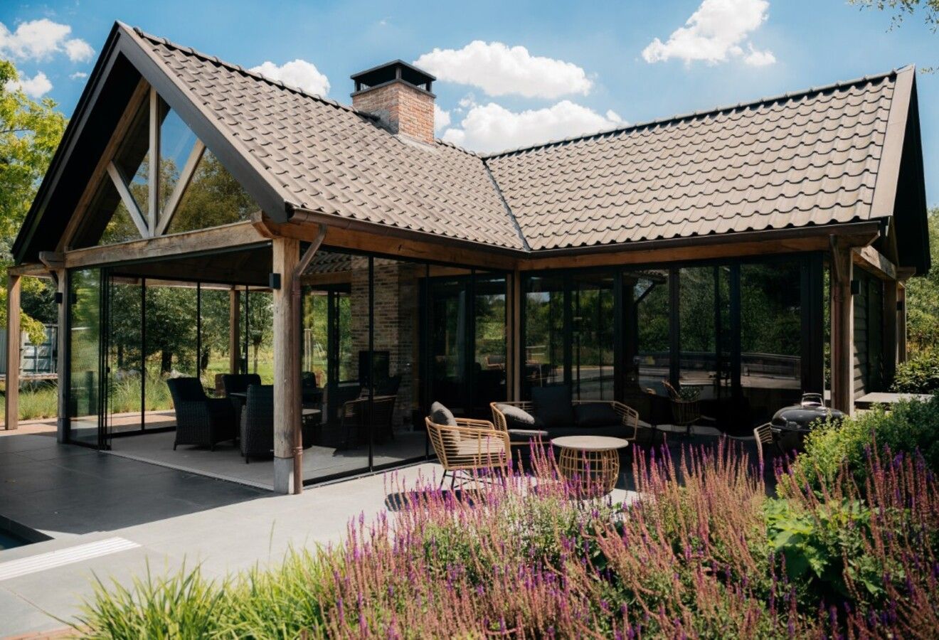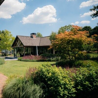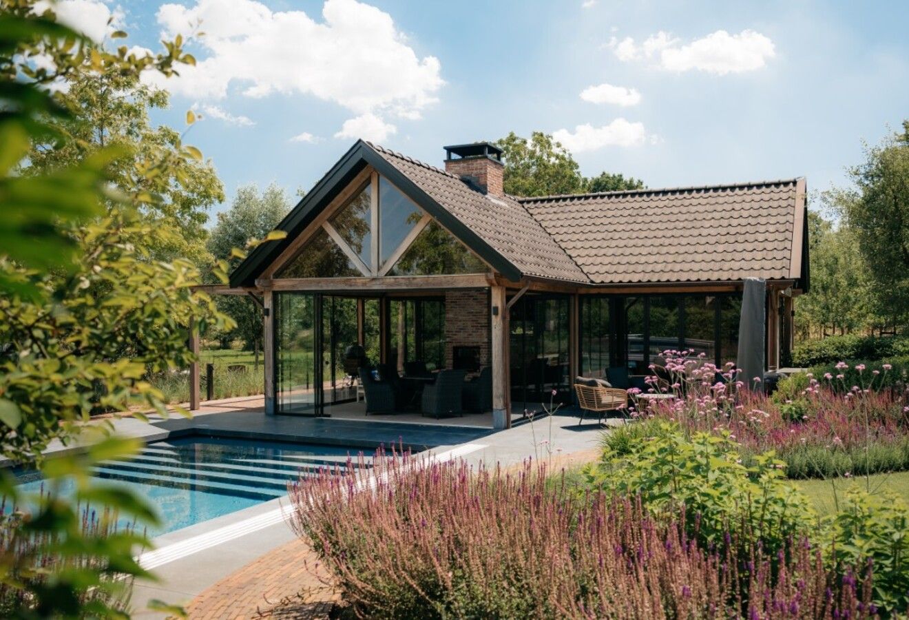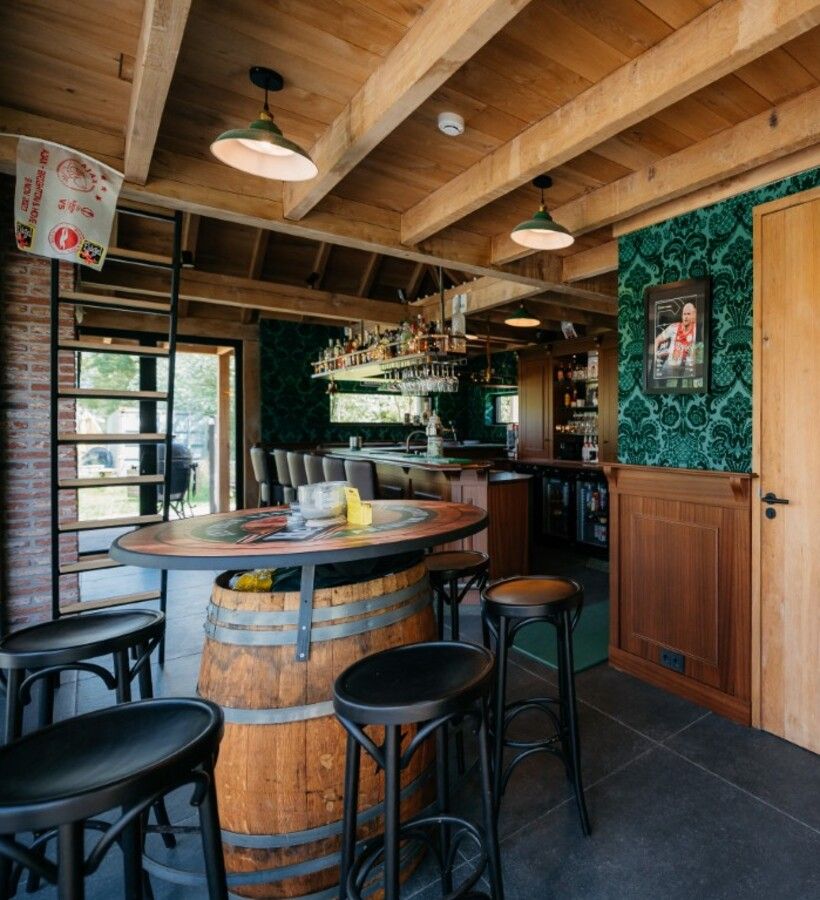 Dit poolhouse ligt prachtig in de mooie tuin en is een onderdeel van het grote geheel. Op het perceel is in dezelfde stijl een mooie houten schuur geplaatst. Ook de houten toegangspoort geeft een mooie, landelijke aanzicht. Binnen is het zitgedeelte geheel gemaakt in de stijl van een Irish pub. Kortom, een prachtig resultaat!
