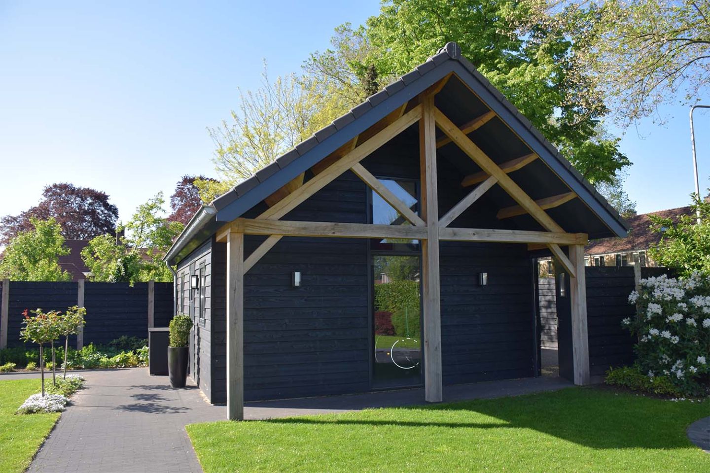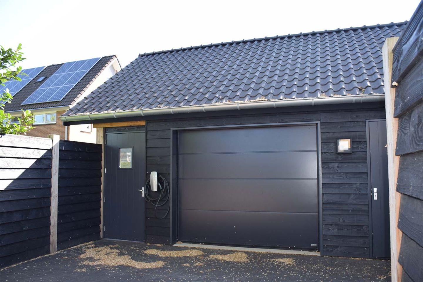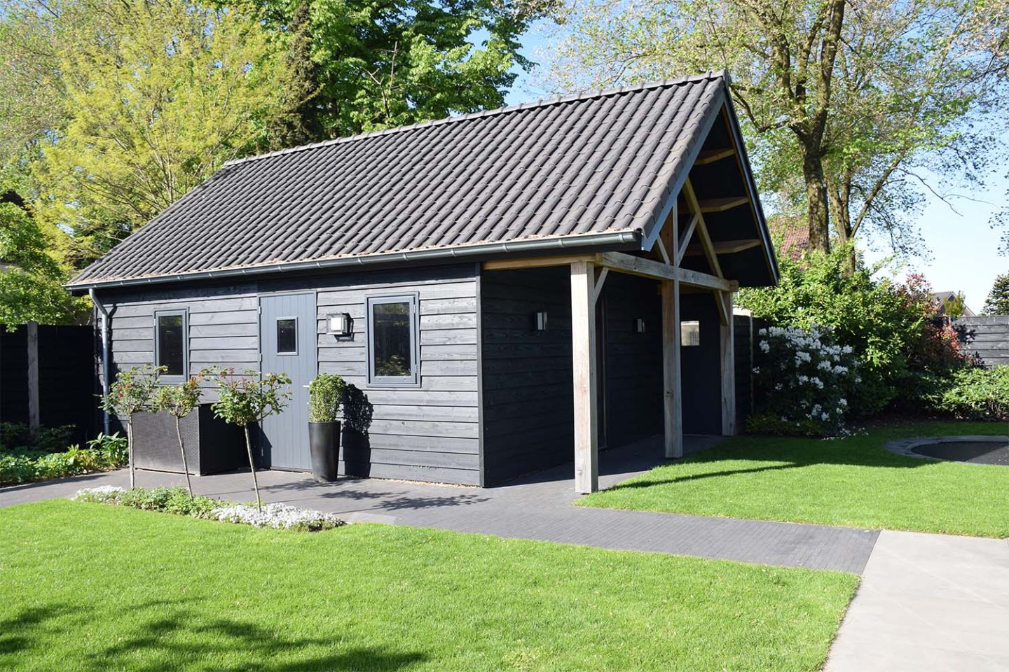 Deze stijlvolle schuur is een prachtig afgewerkt met een sierlijk spant. Hierdoor vormt deze schuur een mooi aanzicht van de tuin. Vanaf de weg is er een roldeur ingezet, die automatisch bediend kan worden. Door de mooie details aan deze schuur, krijgt de tuin een echte meerwaarde!
