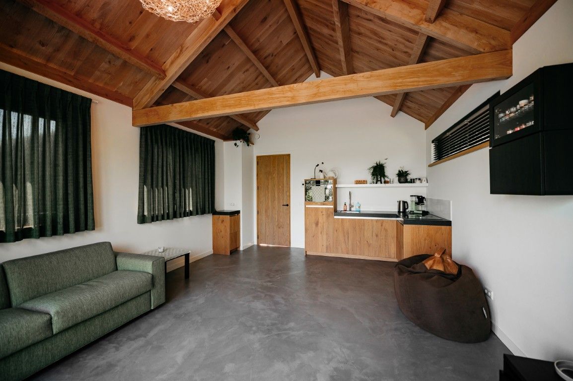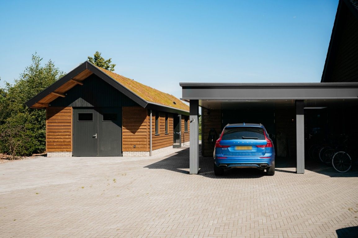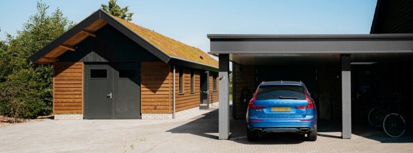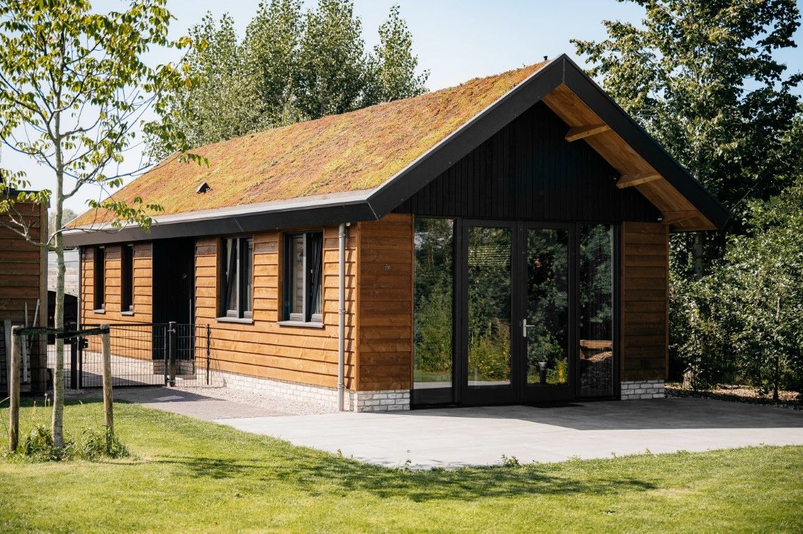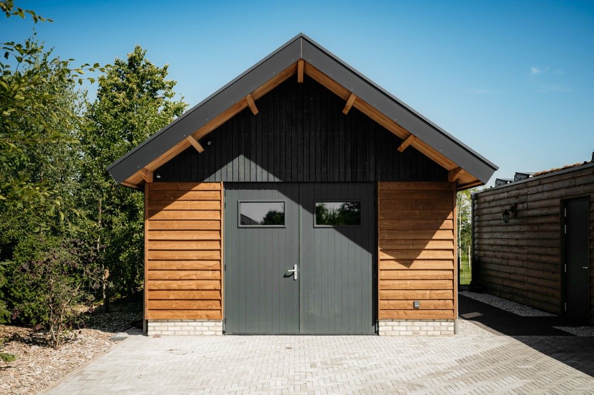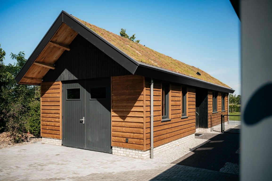 Deze schuur is voorzien van een prachtig groen dak. De voorzijde heeft een langer overstek en via de openslaande schuurdeuren komt u in een prachtig vertrek, voorzien van keuken en een badkamer. Kortom een volledig gerealiseerde tuinschuur / tuinkamer!
