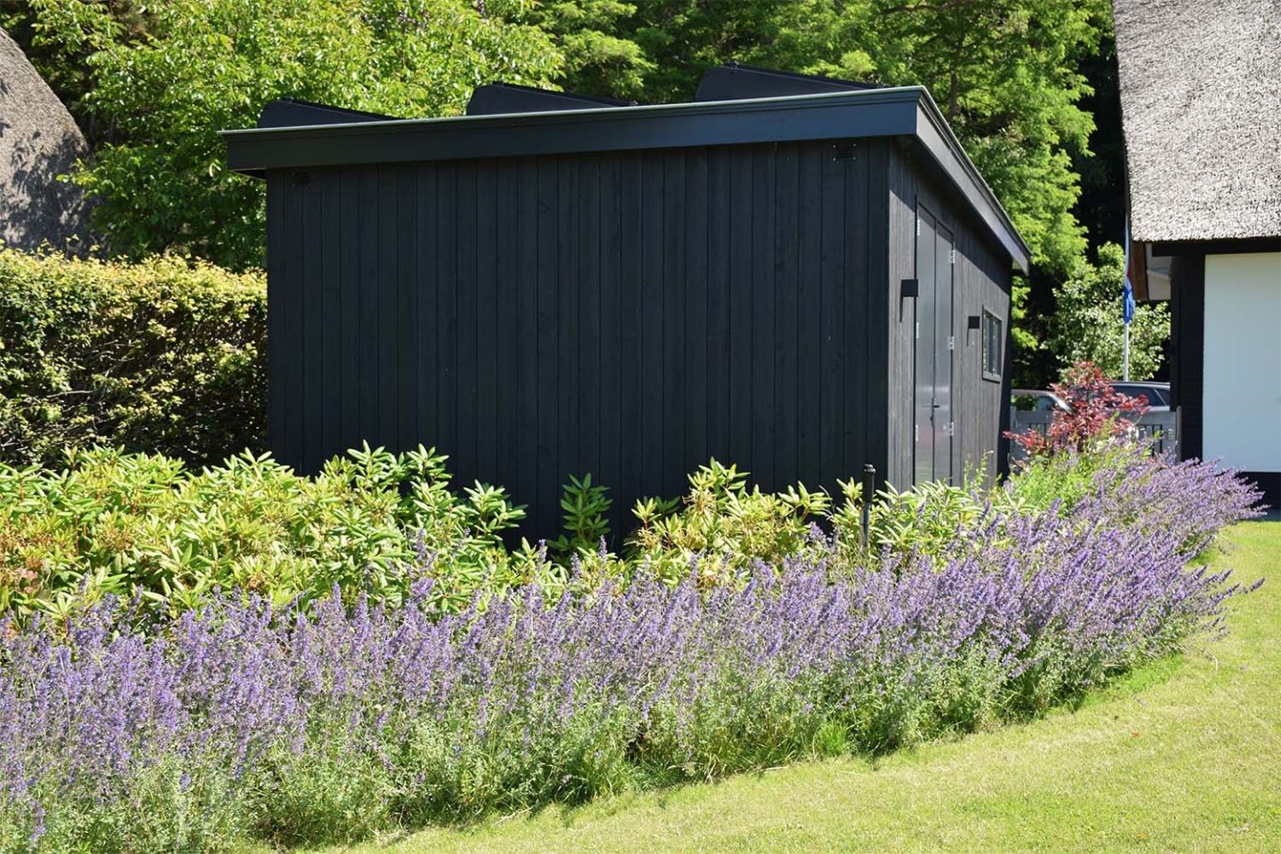 Deze strakke schuur ligt prachtig in de groene tuin. De schuur is afgewerkt met een boeiboard, met een chique kraallijst.
