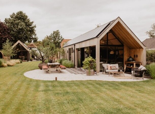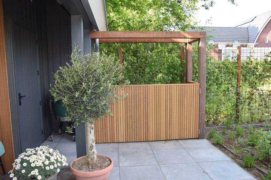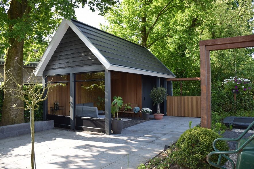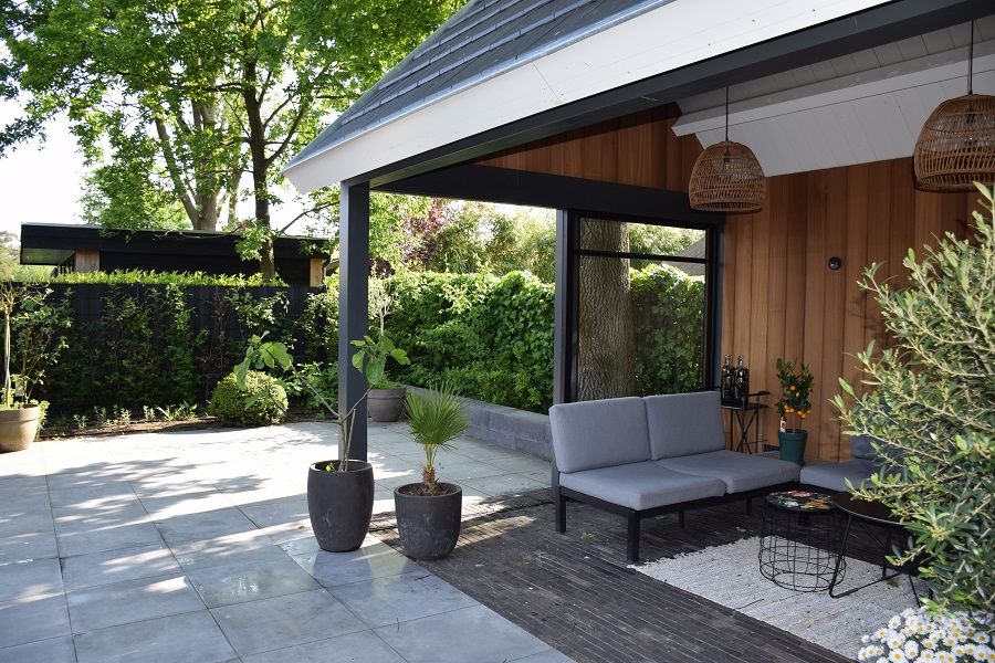 Deze tuinkamer is voorzien van een pannendak en praktische berging. Door de glazen wand is het al snel heerlijk toeven in deze tuinkamer. De wanden in de veranda zijn aan de binnenzijde voorzien van geschaafd Ayous. Dit geeft de veranda een natuurlijke look en staat prachtig bij de andere donkere elementen.