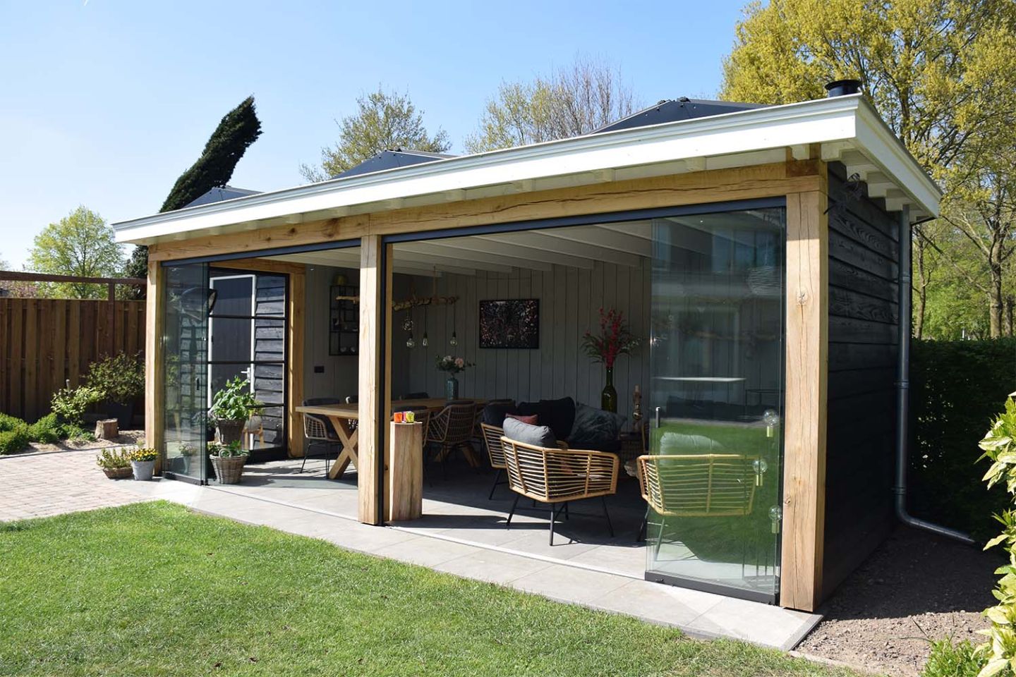 Deze tuinkamer in landelijke stijl is uitgevoerd met een glazen schuifwand, waardoor de eigenaren ook bij mindere weersomstandigheden toch kunnen genieten van hun buitenverblijf.