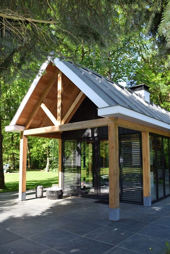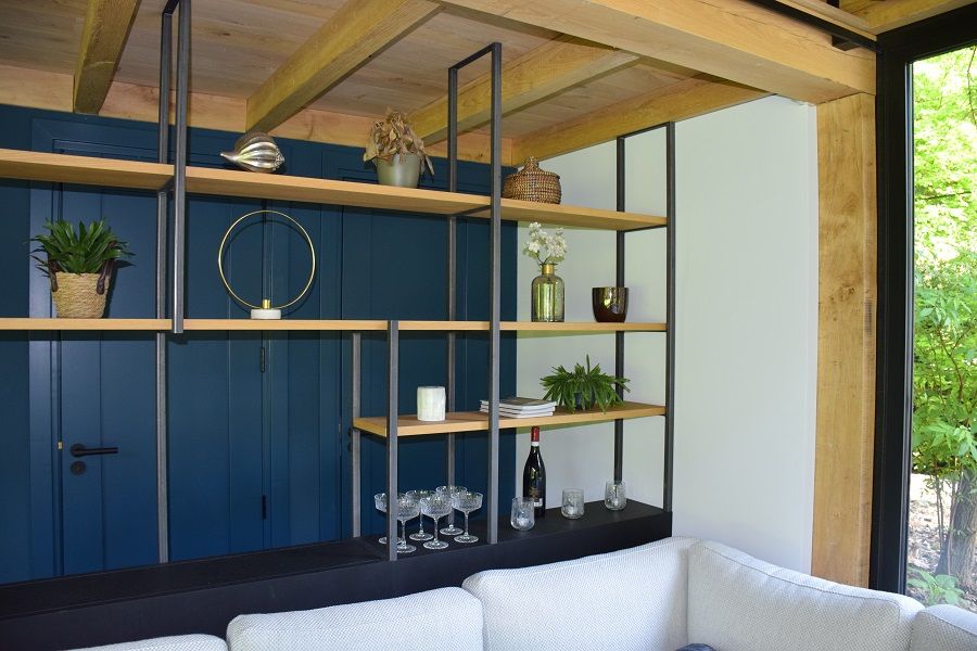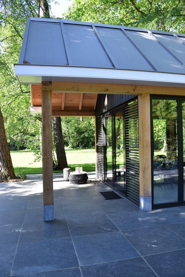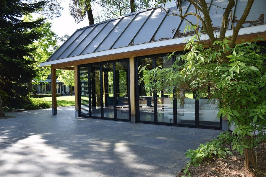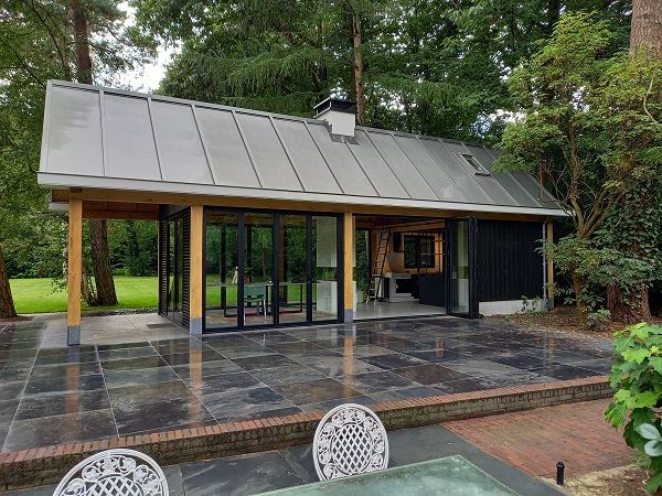 Deze tuinkamer is voorzien van een zinken dak. Door de grote raampartijen is het heerlijk licht in de tuinkamer. Deze glazen wanden kunnen ook worden geopend doormiddel van een schuif- vouwsysteem. De tuinkamer is voorzien van een keuken, kachel en prachtige houtdetails. Kortom, een heerlijke plek om ieder moment van het jaar tot rust te komen!